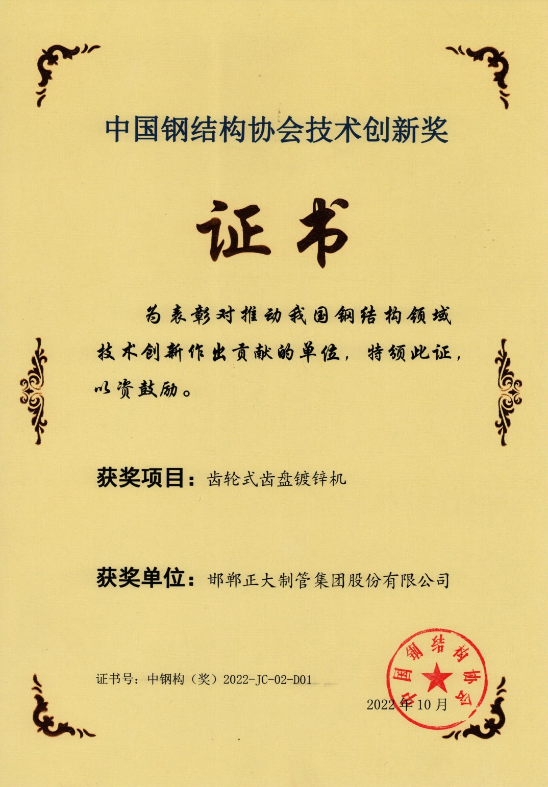 正大制管榮獲中國鋼結(jié)構(gòu)協(xié)會(huì)“技術(shù)創(chuàng)新獎(jiǎng)”